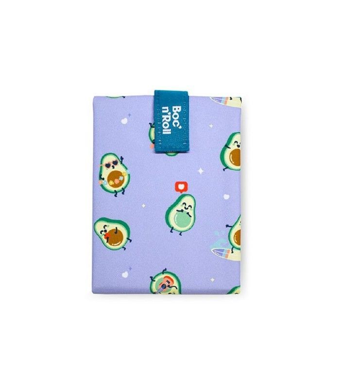 Portabocadillos Boc'n'Roll Mr Wonderful Avocado 2022, ideal para llevar el almuerzo con estilo. Con estampado divertido de aguacates antropomórficos sobre fondo lila, fabricado en poliéster resistente. Perfecto para niños y adultos que buscan funcionalidad y diseño. Incluye cierre con cremallera y etiqueta distintiva. Ideal para el colegio, la ofic