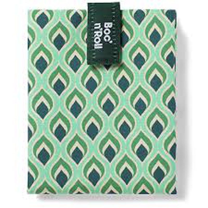Portabocadillos Boc'n'Roll Vintage Flame con diseño geométrico en tonos verdes y azules. Ideal para llevar el almuerzo con estilo y comodidad. Fabricado en poliéster y algodón, resistente y fácil de limpiar. Perfecto para el día a día, trabajo o escuela.