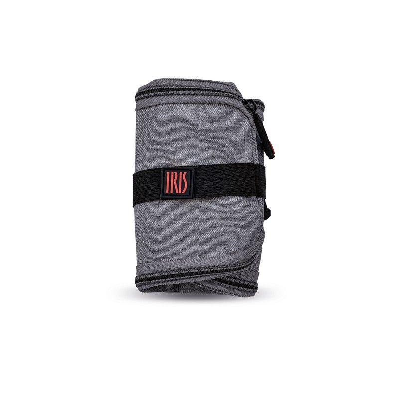 Portabocatas ajustable en gris jaspeado con cinta negra y logo rojo 'IRIS'. Fabricado en poliéster y algodón, ideal para llevar bocadillos o alimentos en el día a día. Su diseño compacto y plegable lo hace perfecto para el trabajo, la escuela o el ocio. Mantén tus alimentos frescos y organizados con estilo.