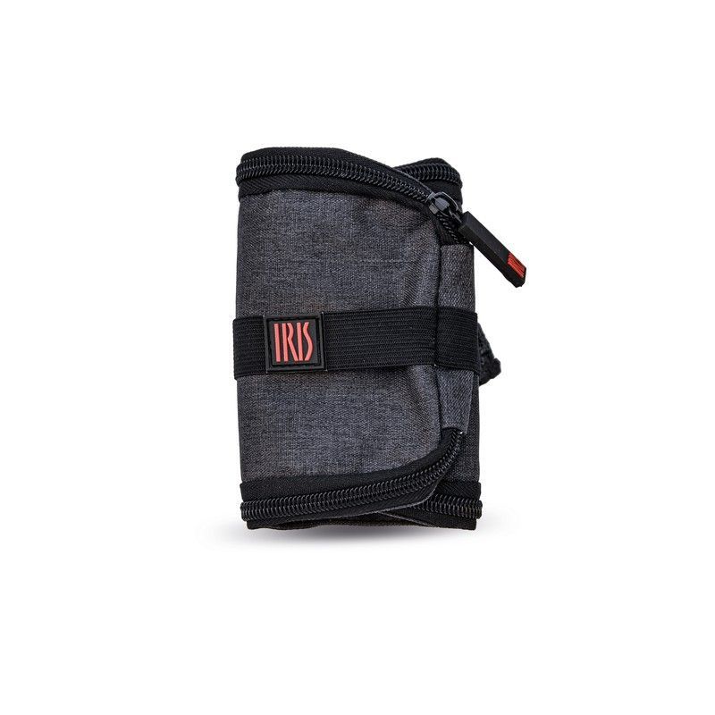 Portabocatas ajustable Iris en color negro jaspeado, ideal para llevar alimentos de forma práctica y segura. Fabricado en poliéster resistente con cierre de cremallera y banda elástica con logo. Perfecto para el trabajo, escuela o viajes. Mantén tus bocadillos frescos y organizados con estilo.