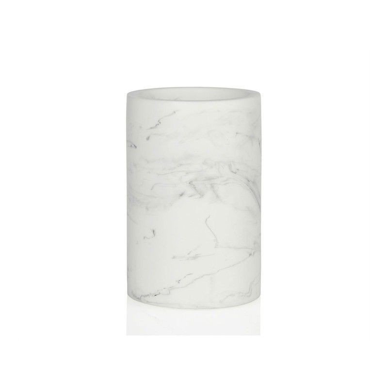 Portacepillos de poliresina en blanco con diseño imitación mármol, ideal para decorar el baño con estilo. Su acabado mate y vetas grises le dan un toque elegante y moderno. Perfecto para mantener los cepillos organizados y a la vista. Colección Marble.
