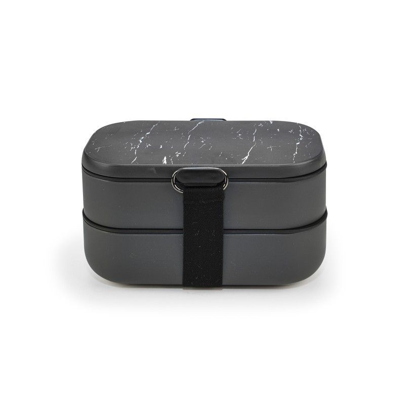 Portacomida Lunchbag Bento Negro Mármol de 1,35 L, ideal para llevar comidas al trabajo o a la escuela. Con diseño elegante de mármol en la tapa y estructura de dos niveles, fabricado en plástico resistente. Incluye correa elástica para un cierre seguro. Perfecto para mantener tus alimentos organizados y frescos durante todo el día.