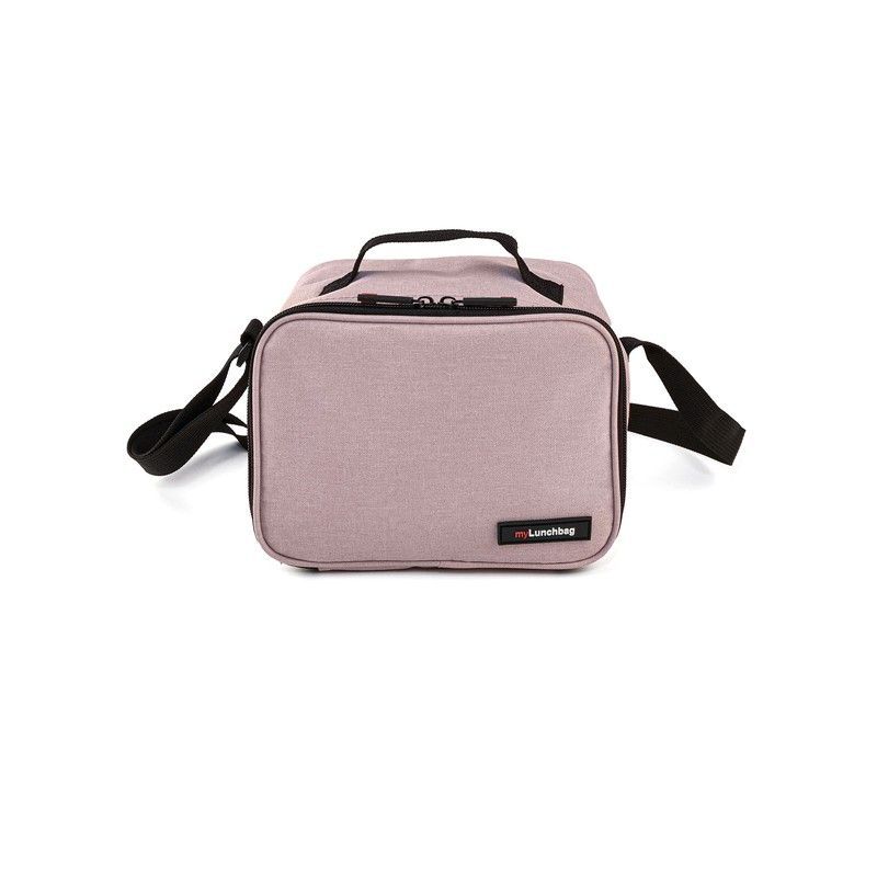 Portacomida Lunchbag Goglass en color rosa, fabricado en lona resistente con cierre de cremallera y correa ajustable. Ideal para llevar comidas al trabajo, escuela o viajes. Diseño elegante y funcional con acabados en negro. Incluye contenedor de vidrio de 840 ml (no visible en imagen, pero mencionado en producto).