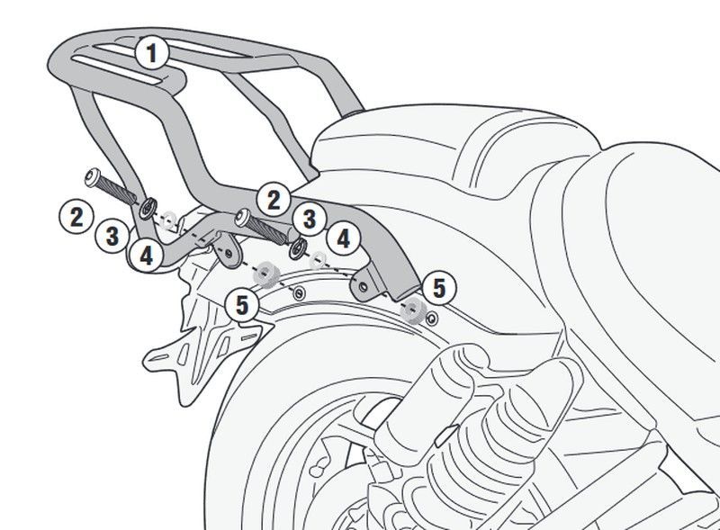 Portaequipajes Givi para Honda CMX1100 Rebel 21, fabricado en metal resistente y diseñado para una instalación segura en la parte trasera de la motocicleta. Ideal para viajes largos y transporte de equipaje, ofrece una solución práctica y duradera. Incluye puntos de fijación numerados para una instalación precisa y segura.
