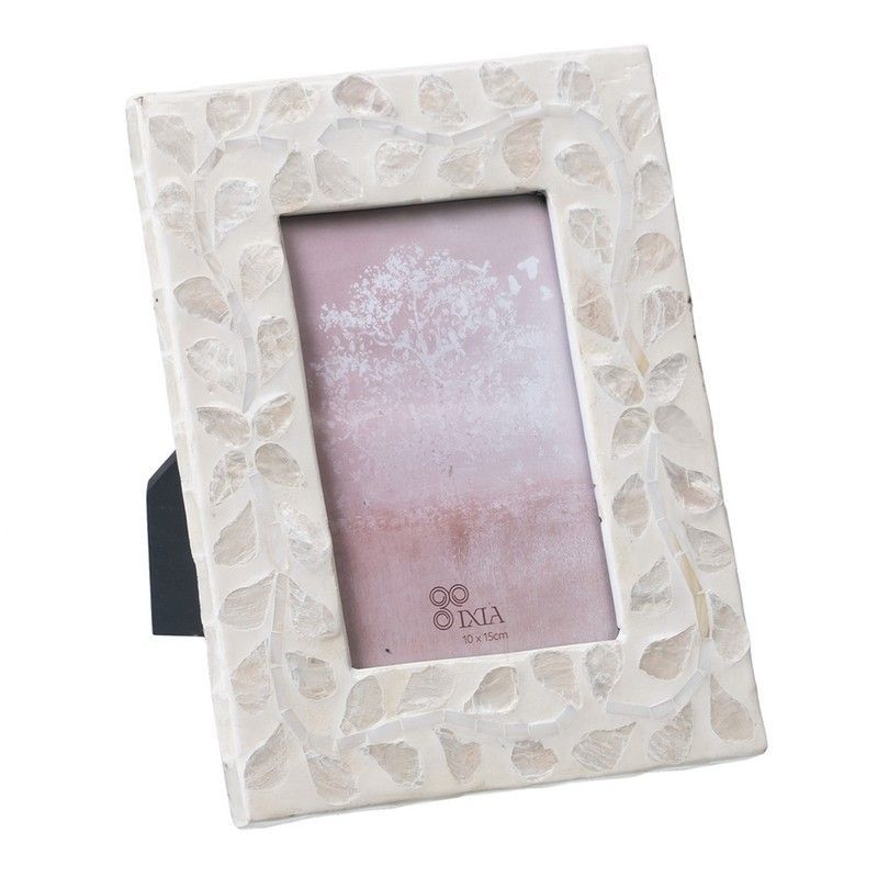 Portafotos 10x15 cm de la marca Ixia en tono beige nácar, con elegante diseño de hojas en relieve. Ideal para decorar tu hogar con estilo y sofisticación. Fabricado con resina y nácar, ofrece un acabado mate y perlado que resalta la belleza de tus fotografías. Perfecto para regalar o como detalle decorativo en mesas, estanterías o escritorios.