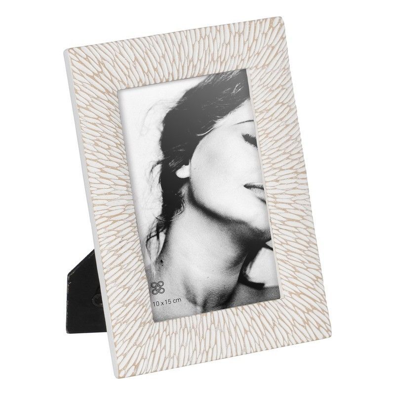 Portafotos 10x15 Blanco Ixia con diseño elegante y textura abstracta en tonos beige y blanco. Fabricado en madera, ideal para decorar tu hogar con estilo. Incluye soporte para colocarlo sobre mesas, estanterías o cómodas. Perfecto para mostrar tus recuerdos favoritos con un toque sofisticado y moderno.