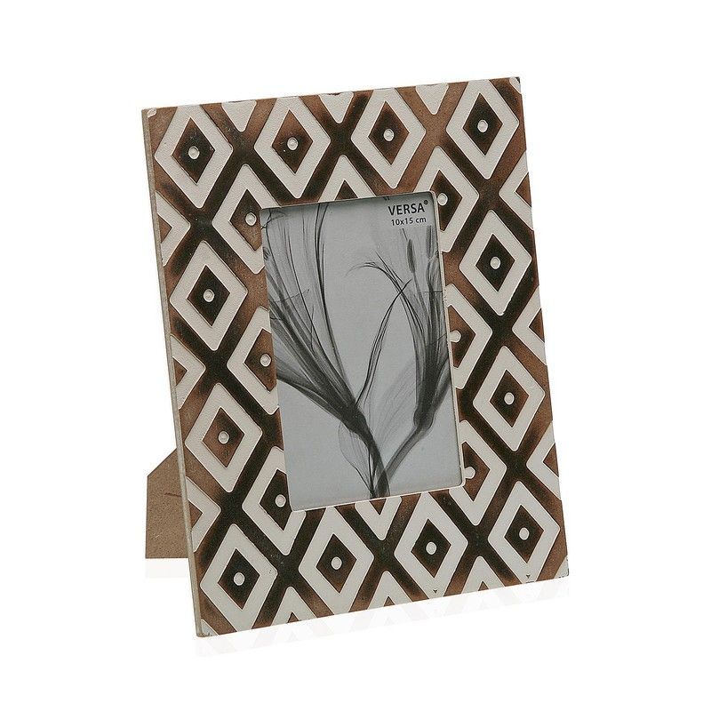 Elegante marco para fotos de 10x15 cm con diseño geométrico en tonos marrón y blanco, ideal para decorar tu hogar con estilo. Fabricado en madera, presenta un patrón de rombos entrelazados con detalles circulares que aportan un toque moderno y sofisticado. Perfecto para exhibir tus recuerdos favoritos sobre cualquier superficie. Incluye soporte tra