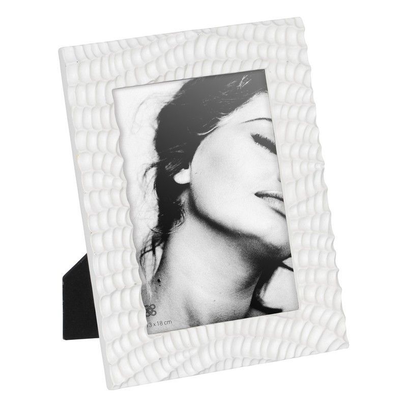 Portafotos 13x18 Blanco Ixia con elegante diseño texturizado en relieve, ideal para decorar tu hogar o oficina. Fabricado en resina de alta calidad con acabado blanco puro, incluye soporte para colocarlo sobre cualquier superficie. Perfecto para exhibir tus mejores recuerdos con estilo y sofisticación.