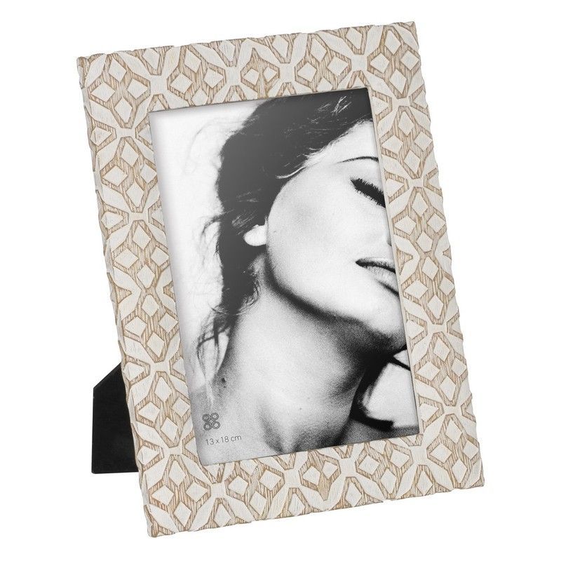 Portafotos 13x18 Blanco Natural Ixia con elegante diseño geométrico en tonos blanco y dorado. Fabricado en madera, ideal para decorar tu hogar con estilo. Su patrón de rombos entrelazados aporta un toque sofisticado y moderno. Perfecto para exhibir tus fotos favoritas sobre mesas, estanterías o escritorios.