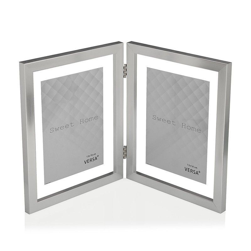Portafotos doble de 13x18 cm con acabado plateado en acero inoxidable, ideal para decorar tu hogar con estilo. Diseño elegante con bisagras centrales que permiten mostrar dos fotos simultáneamente. Perfecto para salones, mesitas de noche o escritorios. Incluye fondo texturizado con grabado 'Sweet Home' para un toque sofisticado.