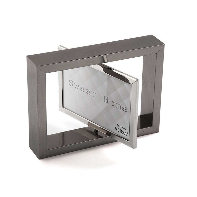Portafotos de diseño moderno en acero inoxidable con acabado cepillado, ideal para decorar tu hogar con estilo. Incluye espejo interior con texto 'Sweet Home' y soporte giratorio para mostrar tus fotos favoritas de 15x10 cm. Perfecto para mesas, estanterías o como regalo elegante.