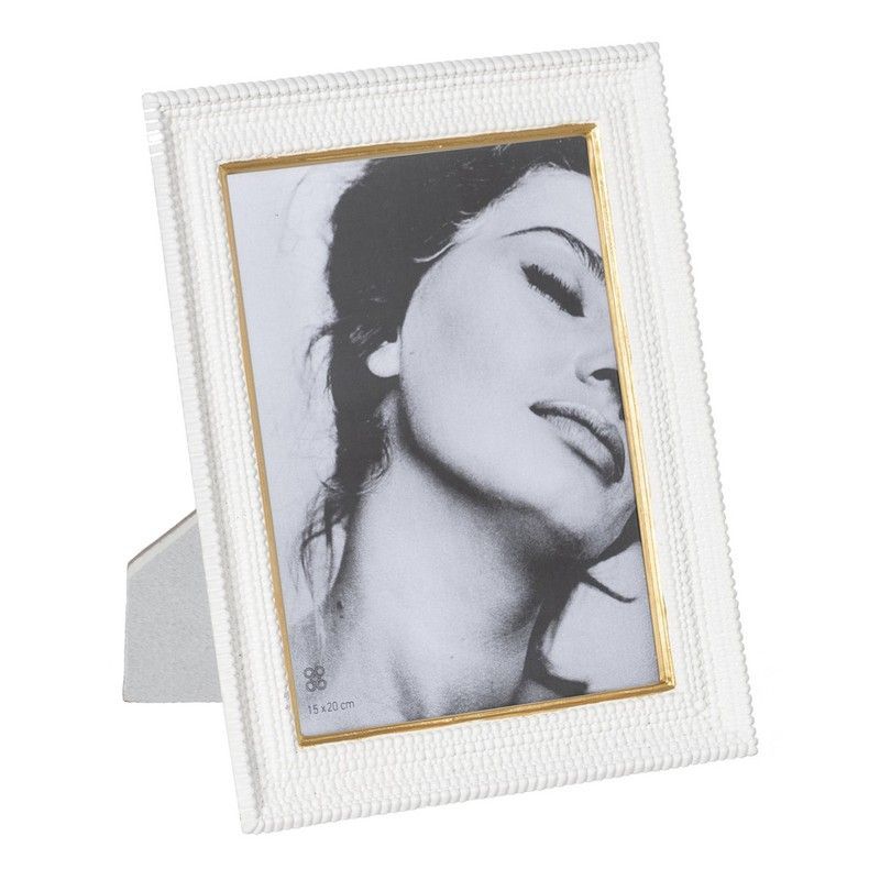 Portafotos Ixia de 15x20 cm con elegante diseño en blanco y detalles dorados. Fabricado en metal con textura trenzada y borde interior dorado, ideal para decorar tu hogar con estilo. Incluye soporte para colocarlo sobre mesas, estanterías o cómodas. Perfecto para exhibir tus fotos favoritas con un toque sofisticado y moderno.
