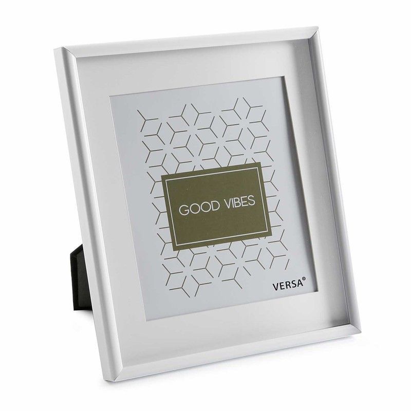 Portafotos 20x25 de diseño moderno con marco blanco brillante y patrón geométrico interior. Ideal para decorar tu hogar con estilo y buenos recuerdos. Incluye placa con texto 'GOOD VIBES' en verde, perfecto para transmitir positividad. Fabricado en metal de calidad, resistente y elegante. Adecuado para fotos o tarjetas decorativas.