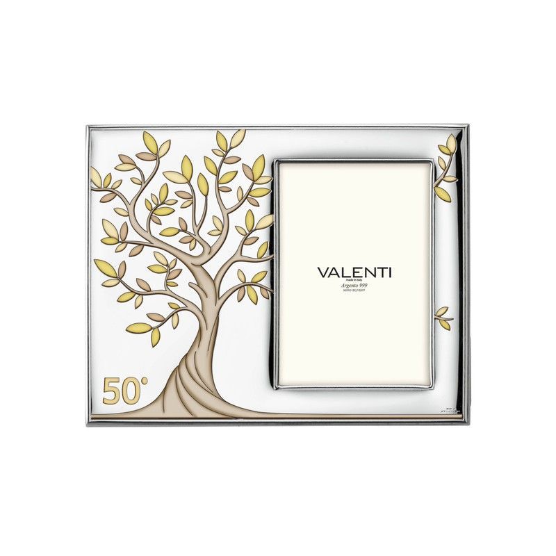 Portafotos conmemorativo de 10x15 cm con diseño del Árbol de la Vida en tonos dorados y marrones, ideal para celebrar 50 años. Con acabado plateado y elegante estampado, es perfecto para regalar en aniversarios o eventos especiales. Incluye espacio para foto y detalles de la marca Valenti. Embalaje de lujo para una presentación impecable.
