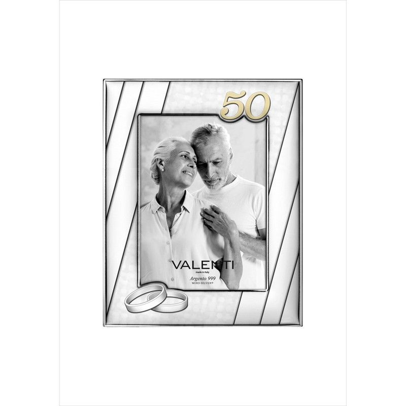 Portafotos conmemorativo para 50 años de matrimonio, ideal para parejas celebrando su aniversario de oro. Diseño elegante en metal plateado con detalles dorados y líneas diagonales. Incluye imagen de una pareja y dos anillos de boda. Perfecto para decorar el hogar o regalar en una ocasión especial. Tamaño 10x15 cm.