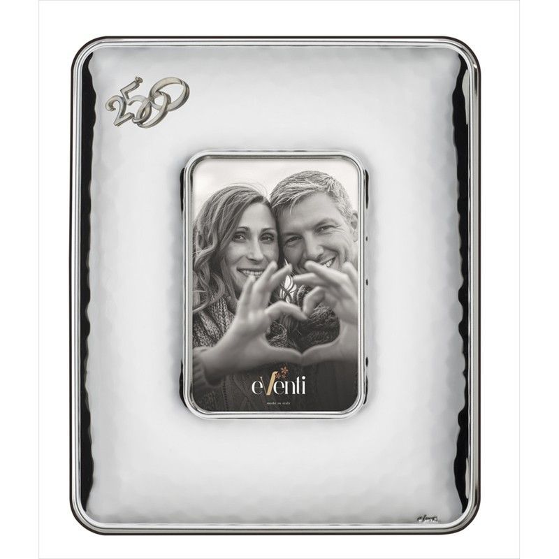 Portafotos conmemorativo para aniversario de 25 años, fabricado en acero inoxidable con acabado martelé. Diseño elegante con detalle en relieve del número '25' y fondo texturizado blanco. Ideal para celebrar bodas de plata, con capacidad para foto de 10x15 cm. Un regalo sofisticado y duradero para parejas especiales.