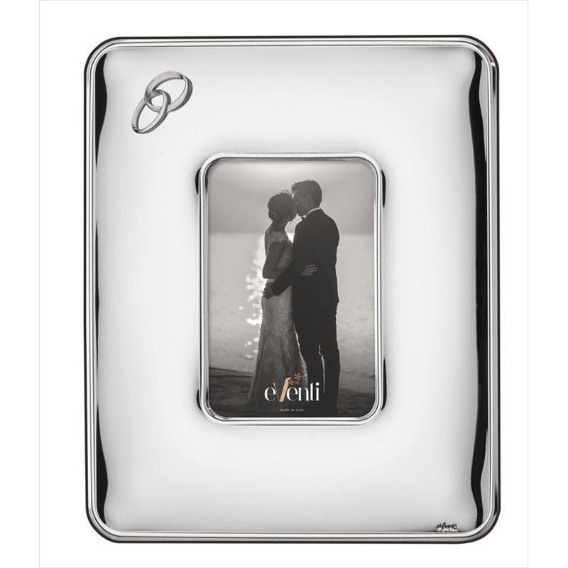 Elegante marco para fotos de aniversario en acero inoxidable con acabado plateado brillante. Diseño romántico con dos anillos entrelazados y recorte para foto 10x15 cm. Ideal para celebrar bodas o momentos especiales. Perfecto como regalo para parejas enamoradas.