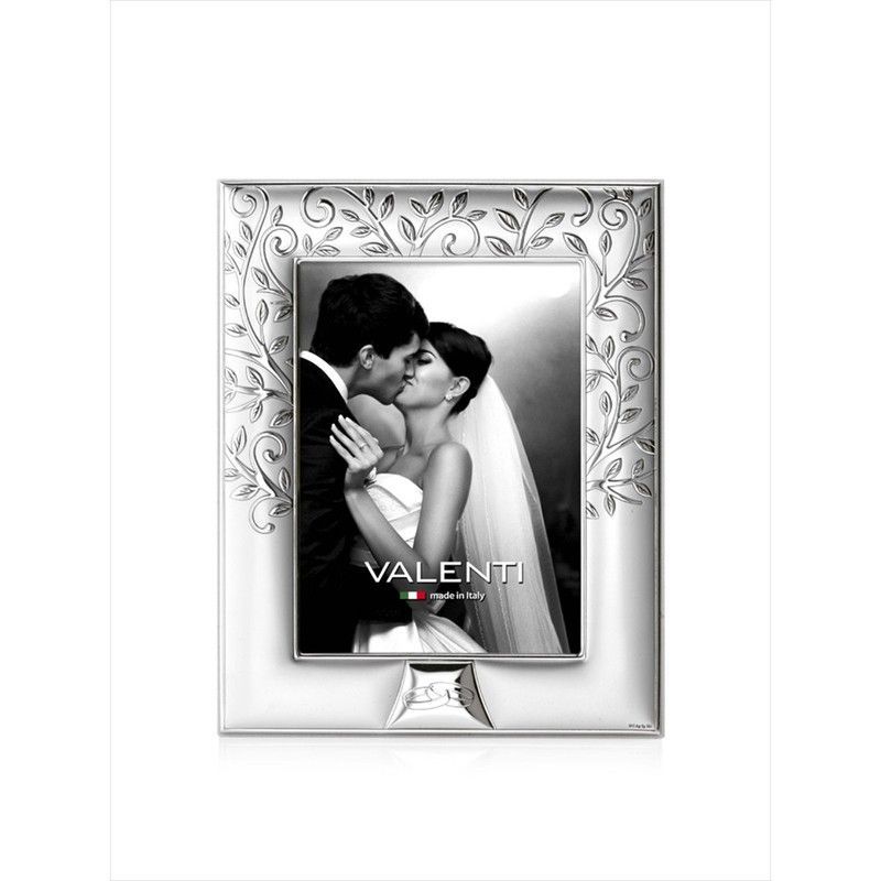 Portafotos Aniversario 13x18cm de Valenti, con elegante diseño de hojas entrelazadas en metal plateado. Ideal para celebrar bodas o aniversarios, este marco combina estilo y sofisticación. Incluye base con forma de anillo de boda, perfecto para exhibir fotos especiales en casa o como regalo conmemorativo. Hecho en Italia, garantiza calidad y durabi