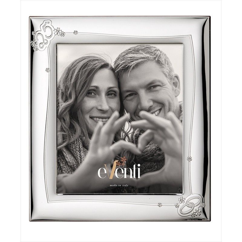 Portafotos Aniversario 13x18cm EV9000/13V Alianzas 25 Años, con elegante acabado plateado y detalles de anillos entrelazados en las esquinas. Ideal para celebrar bodas de plata, este marco de metal brilla con sofisticación y calidad italiana. Perfecto para exhibir recuerdos especiales en casa o como regalo conmemorativo.
