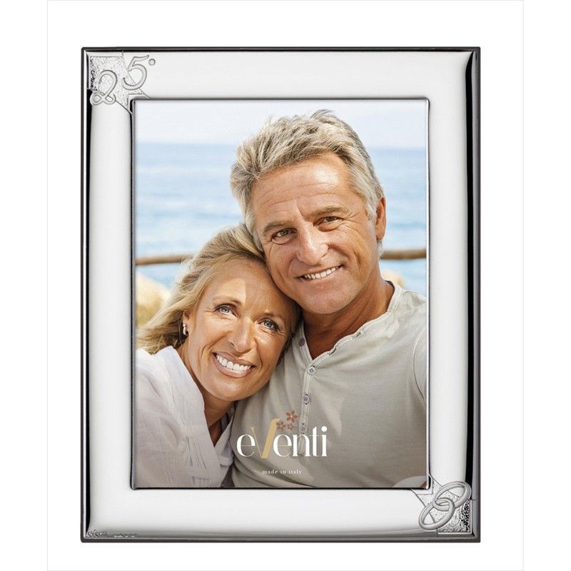 Portafotos conmemorativo para 25 años de matrimonio, ideal para parejas celebrando su aniversario de plata. Diseño elegante con marco metálico plateado y detalles de anillos entrelazados. Incluye fondo blanco y espacio para foto de 13x18 cm. Perfecto como regalo significativo y decorativo para el hogar.