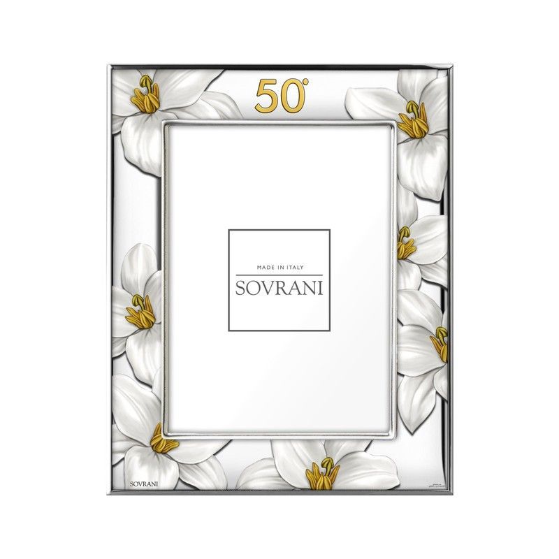 Portafotos Sovrani de 13x18 cm con diseño elegante de azucenas blancas y detalles dorados, ideal para celebrar 50 años. Fabricado en Italia con acabado metálico plateado brillante. Perfecto para regalar en aniversarios o conmemoraciones especiales. Materiales de alta calidad para un toque sofisticado en cualquier hogar.