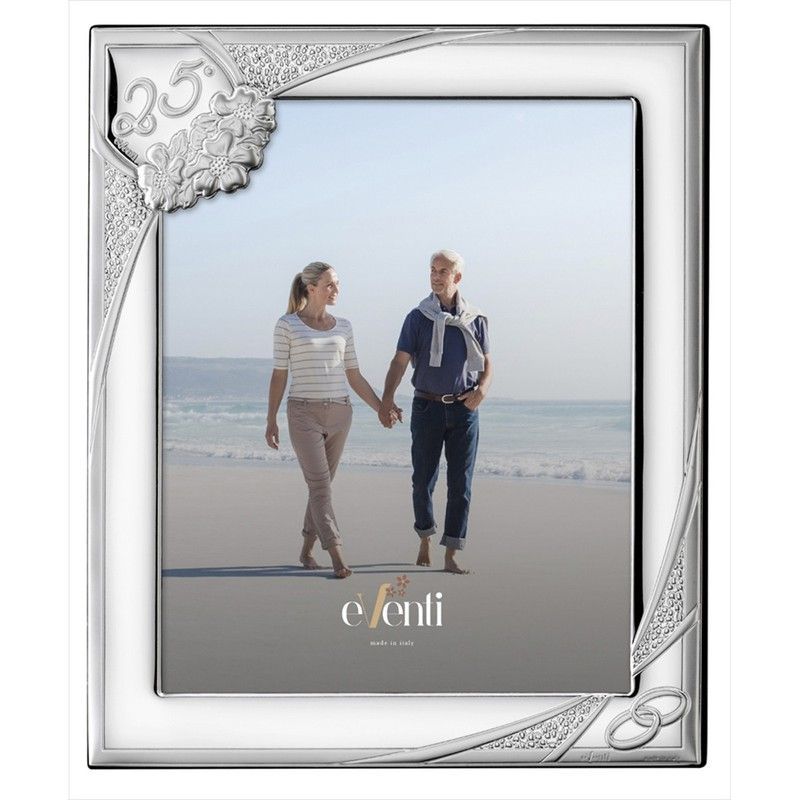 Portafotos conmemorativo para aniversario de 25 años, ideal para parejas. Fabricado en metal con acabado plateado brillante, presenta detalles florales y el número '25' en relieve, junto con dos anillos entrelazados. Diseño elegante y sofisticado para exhibir fotos de 15x20 cm. Perfecto como regalo para celebrar bodas de plata.