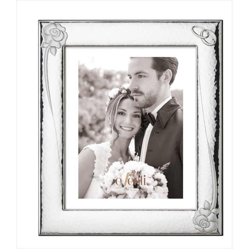 Portafotos Aniversario 15x20cm EV9150/15A con diseño elegante en metal plateado, adornado con detalles de rosas y anillos en las esquinas. Ideal para celebrar momentos especiales como bodas o aniversarios. Su acabado sofisticado y diseño romántico lo convierten en un regalo perfecto para parejas. Incluye espacio para una foto de 15x20 cm.
