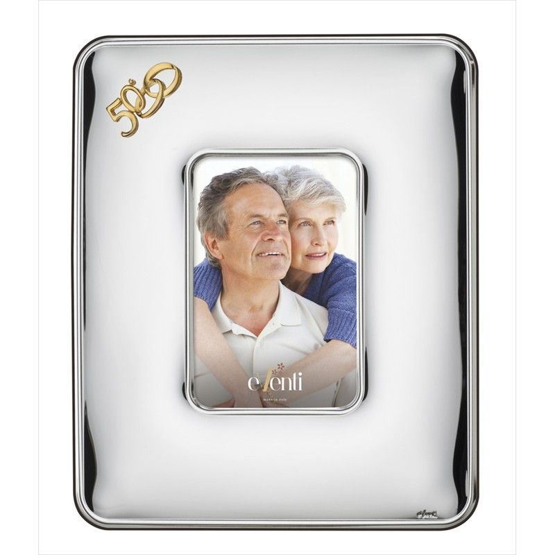 Elegante marco para fotos de 15x20 cm con acabado plateado y detalle dorado con el número '50' y anillos entrelazados, ideal para celebrar bodas de oro. Fabricado en acero inoxidable de alta calidad, perfecto para conservar recuerdos especiales con estilo y sofisticación.
