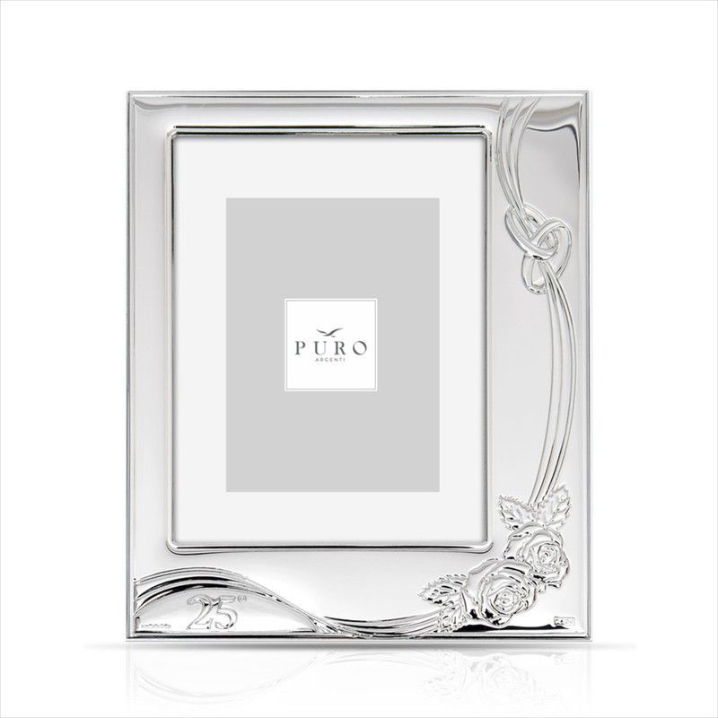 Portafotos Aniversario 15x20 cm PU8214/15 Alianzas 25 Años Rosas, con elegante diseño en metal plateado y detalles de rosas talladas. Ideal para celebrar bodas de plata, con acabado brillante y estilo clásico. Perfecto para exhibir recuerdos especiales en casa o como regalo conmemorativo.
