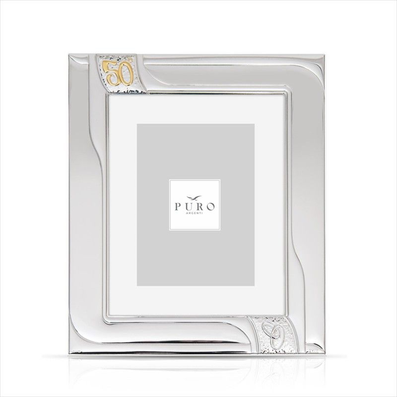 Portafotos conmemorativo de 15x20 cm para celebrar 50 años de matrimonio. Fabricado en metal con acabado plateado brillante y detalles dorados con el número '50'. Diseño elegante y sofisticado, ideal para regalar en aniversarios de oro. Incluye espacio para una foto de tamaño estándar. Un detalle perfecto para preservar recuerdos especiales con est