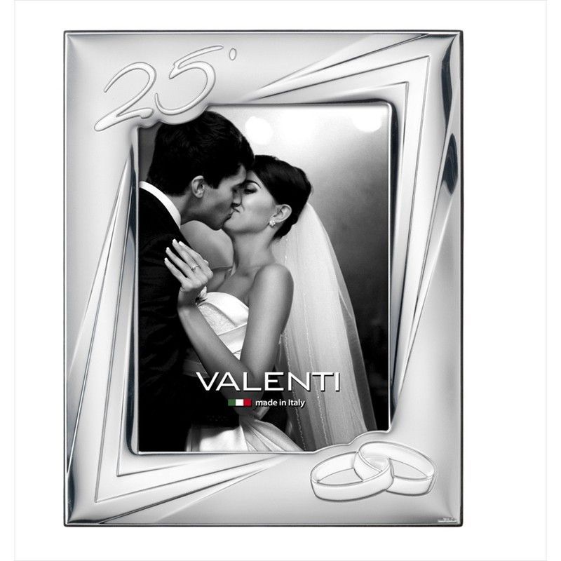 Elegante marco para fotos de 18x24 cm con diseño conmemorativo de 25 años de matrimonio. Fabricado en metal con acabado plateado, incluye detalles grabados como anillos de boda y la inscripción '25°'. Ideal para celebrar el aniversario de bodas, con un toque sofisticado y personalizado. Hecho en Italia por Valenti, garantiza calidad y estilo para d