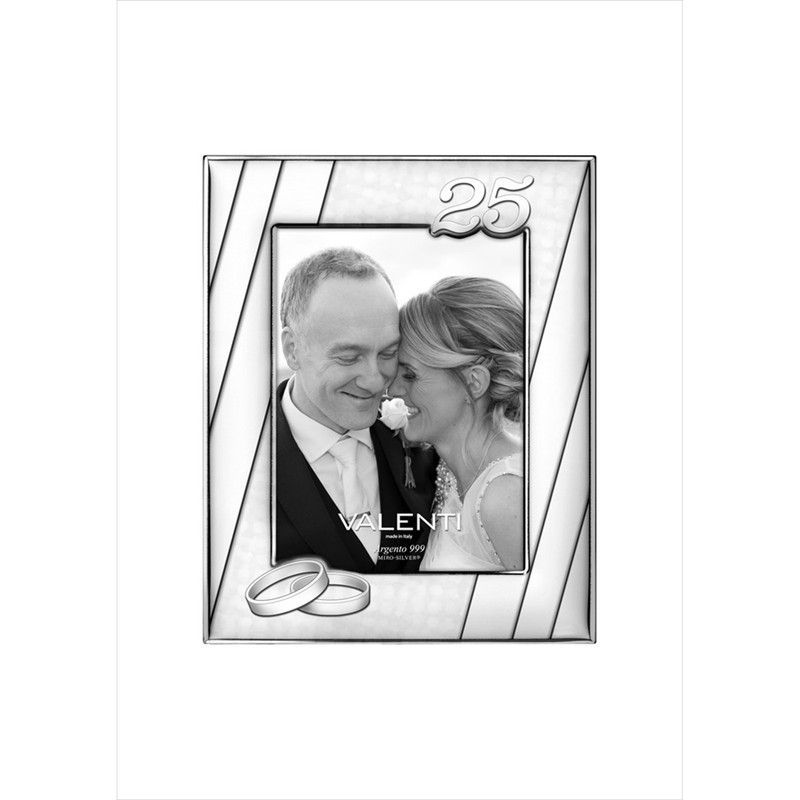 Portafotos conmemorativo para el 25º aniversario de boda, ideal para celebrar la eternidad del amor. Fabricado en metal con acabado plateado, presenta un diseño elegante con líneas diagonales y detalles de anillos y el número '25'. Perfecto para exhibir una foto especial de la pareja en blanco y negro. Un regalo significativo y duradero para conmem