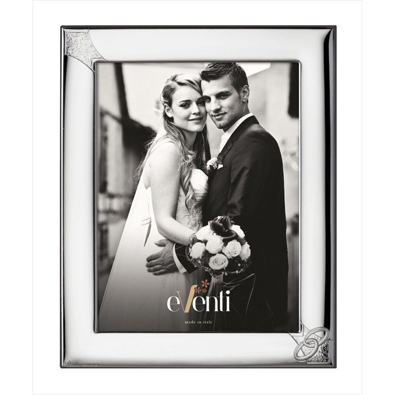 Portafotos Aniversario 18x24cm EV9100/9A Alianzas, con acabado plateado brillante y diseño elegante. Ideal para celebrar momentos especiales como bodas o aniversarios. Fabricado en metal de alta calidad, con borde interior blanco que resalta la foto. Perfecto para decorar el hogar con estilo y sofisticación.