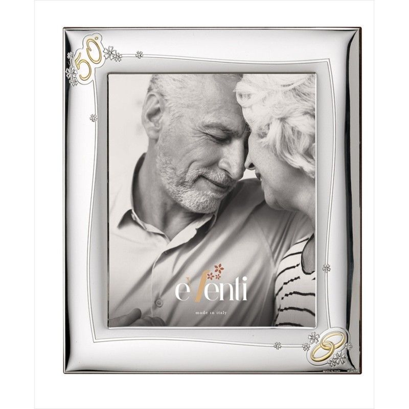 Portafotos conmemorativo para aniversario de 50 años, con elegante acabado plateado y detalles dorados en forma de anillos entrelazados. Ideal para celebrar bodas de oro, este marco de metal de 20x25 cm combina sofisticación y romanticismo. Perfecto para exhibir momentos especiales de una pareja, con un diseño clásico y duradero que resalta la bell