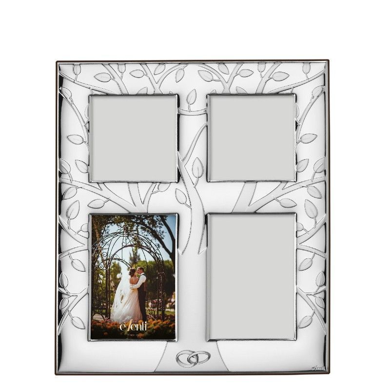 Portafotos Aniversario 20x25cm EV9240/25A con diseño elegante de Árbol de la Vida y detalles de anillos entrelazados, ideal para celebrar momentos especiales. Fabricado en metal con acabado plateado, incluye cuatro espacios para fotos de distintos tamaños. Perfecto para decorar el hogar o regalar en ocasiones especiales como bodas o aniversarios.