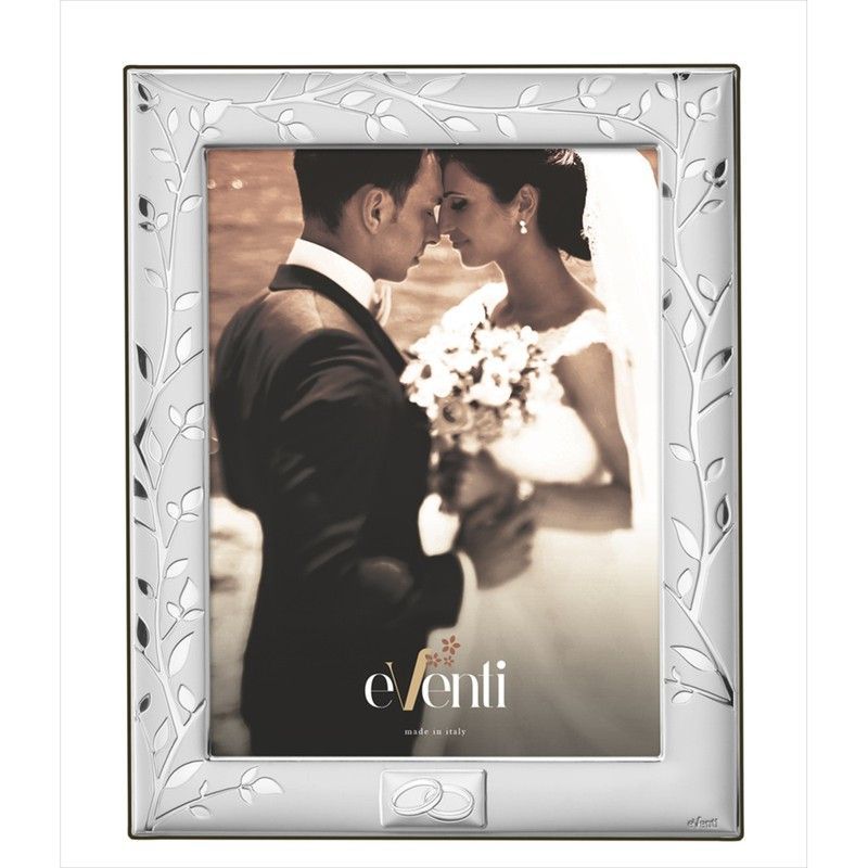 Portafotos Aniversario 9x13cm EV9220/9A con diseño elegante de árbol de la vida en metal plateado. Ideal para celebrar bodas, aniversarios o momentos especiales. Con acabado sofisticado y placa con anillos entrelazados, es un regalo perfecto para parejas. Muestra una foto de boda en tonos cálidos. Hecho en Italia, calidad premium.