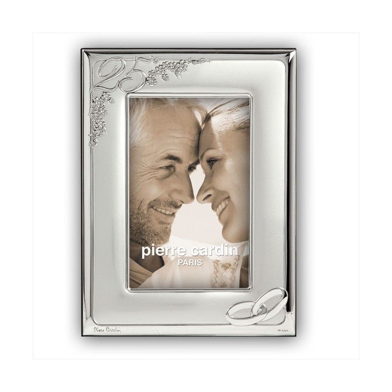 Portafotos Pierre Cardin PT5296/4 para celebrar 25 años de matrimonio, con acabado plateado y diseño elegante. Ideal para parejas que desean conmemorar su aniversario con estilo. Fabricado en metal de alta calidad, incluye detalles como el número '25', anillos entrelazados y decoración floral. Perfecto para exhibir una foto de 15x20 cm en un ambien