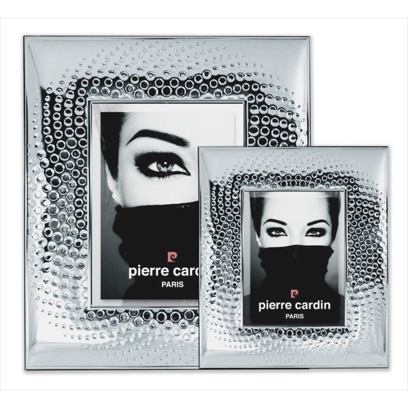 Portafotos Pierre Cardin PT0302/3 de 15x20 cm con elegante diseño en metal plateado y borde ancho decorado con cristales brillantes. Ideal para decorar tu hogar con estilo sofisticado. Incluye imagen de modelo con maquillaje de ojos y logotipo Pierre Cardin Paris. Perfecto para fotos de recuerdo o como regalo exclusivo.