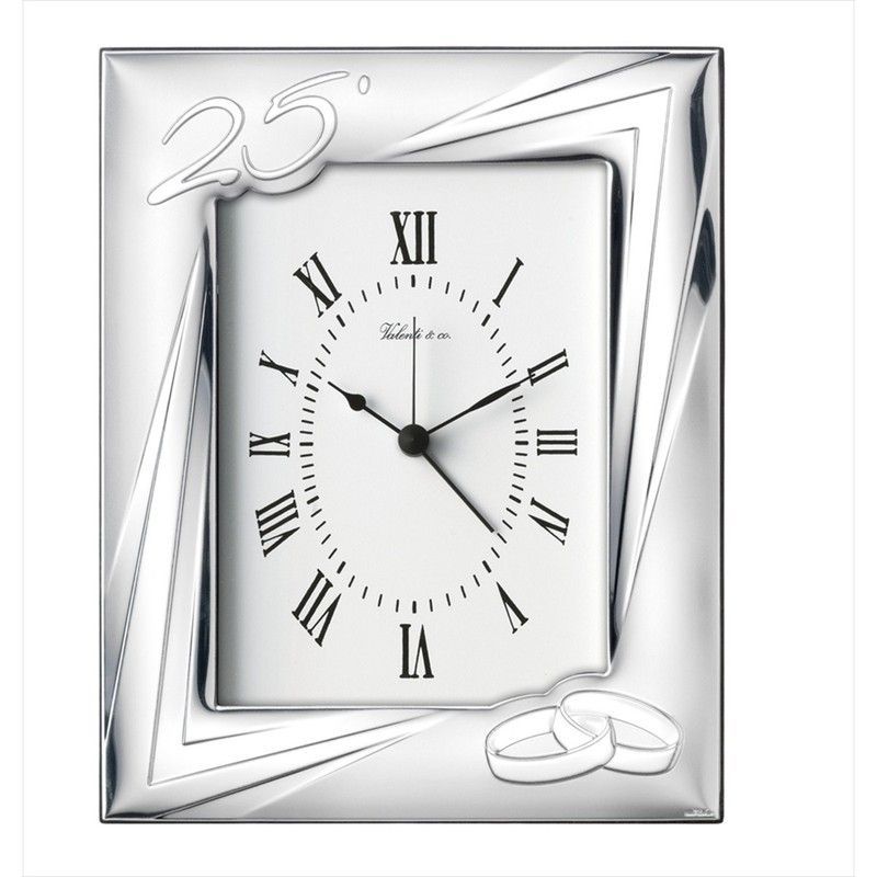 Portafotos reloj conmemorativo para el 25º aniversario de boda, con diseño elegante en metal plateado y esfera blanca con números romanos. Incluye detalles de anillos entrelazados y el número '25°' en relieve. Ideal para decorar el hogar y celebrar una década y media de amor. Fabricado con materiales de calidad para un uso duradero.