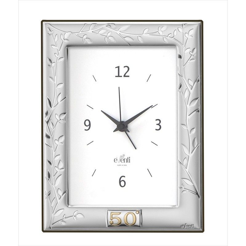 Portafotos reloj conmemorativo de 50 años, ideal para celebrar aniversarios especiales. Con marco metálico plateado con diseño de hojas talladas y esfera blanca con detalles en negro y dorado. Incluye espacio para foto de 9x13 cm. Hecho con materiales de calidad para decorar tu hogar con estilo y significado.