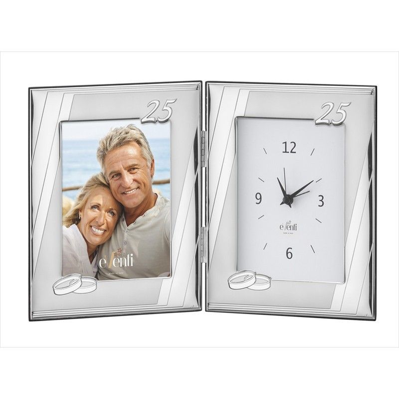 Portafotos-reloj doble con diseño elegante en acabado plateado, ideal para conmemorar 25 años de matrimonio. Incluye un lado para foto de 13x18 cm y otro con reloj analógico. Detalles de anillos y el número '25' en relieve. Hecho en metal y vidrio, perfecto como regalo conmemorativo para parejas.