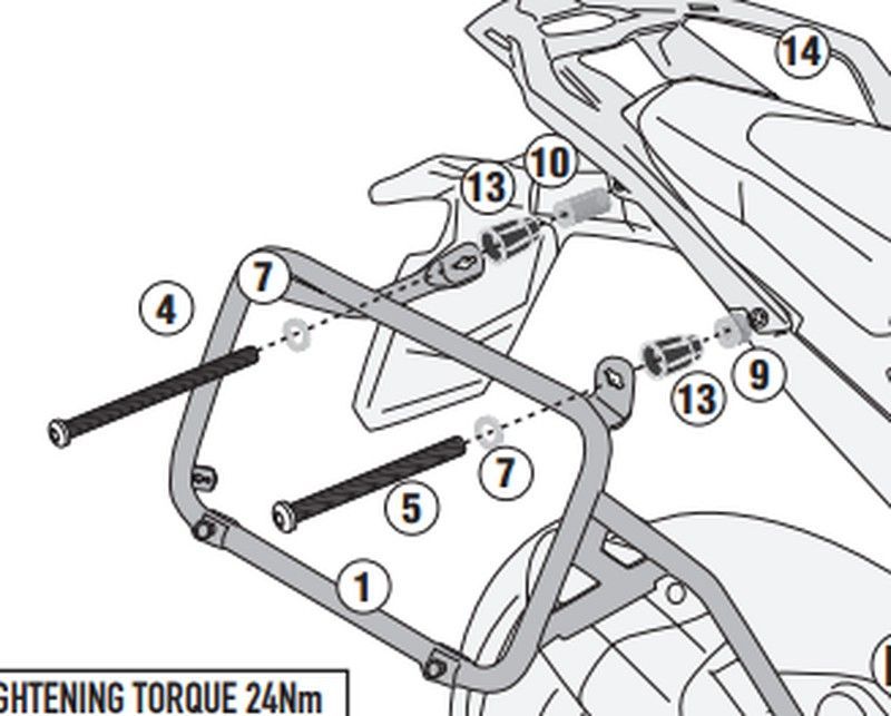 Portamaletas lateral para BMW R 1300 GS (24) con sistema Monokey, fabricado en acero inoxidable para mayor resistencia y durabilidad. Diseño robusto y seguro, ideal para transportar equipaje lateralmente en tu moto. Incluye puntos de fijación precisos y torque de apriete recomendado de 24 Nm. Perfecto para viajes largos y aventuras en carretera.