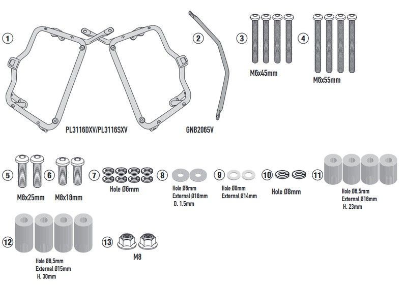 Kit de montaje para portamaletas lateral Givi PL3116, compatible con Suzuki V-Strom 250 (2017-2021). Fabricado en acero inoxidable y metal de alta resistencia, incluye todos los tornillos, arandelas y espaciadores necesarios para una instalación segura y duradera. Ideal para motoristas que buscan una solución fiable para transportar equipaje latera