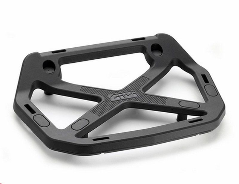 Portapaquetes superior Givi S150 en color negro, fabricado en plástico resistente para una instalación segura en motocicletas. Diseño robusto con estructura en forma de X y puntos de fijación precisos. Ideal para transportar maletas o bolsas de equipaje con estabilidad y seguridad. Compatible con sistemas de carga Givi.