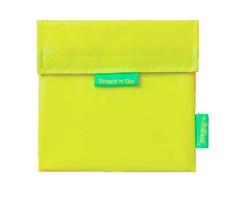 Portasnack Snack'n'Go en color amarillo fluor, ideal para llevar snacks de forma práctica y segura. Fabricado en poliéster resistente, con cierre de solapa para mantener los alimentos frescos. Perfecto para el colegio, la oficina o actividades al aire libre. Diseño liso y moderno con etiquetas verdes que destacan su funcionalidad.
