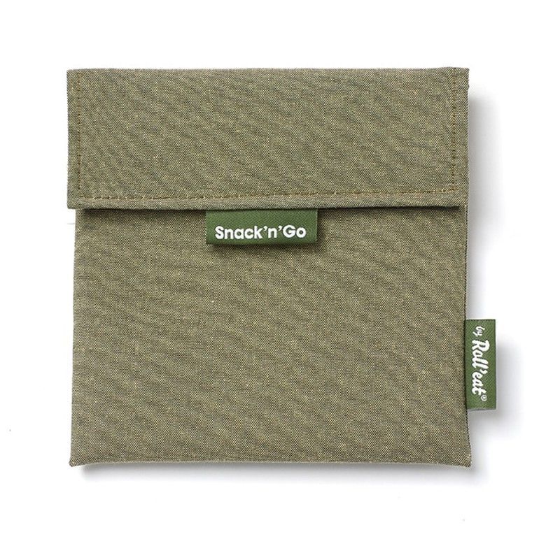 Portasnack Snack'n'Go Nature en color caqui, fabricado en lona resistente y duradera. Ideal para llevar snacks, frutas o pequeños alimentos de forma práctica y ecológica. Perfecto para el colegio, la oficina o las salidas al aire libre. Cierre tipo solapa para mantener el contenido seguro y limpio. Diseño sencillo y funcional con etiquetas verdes q
