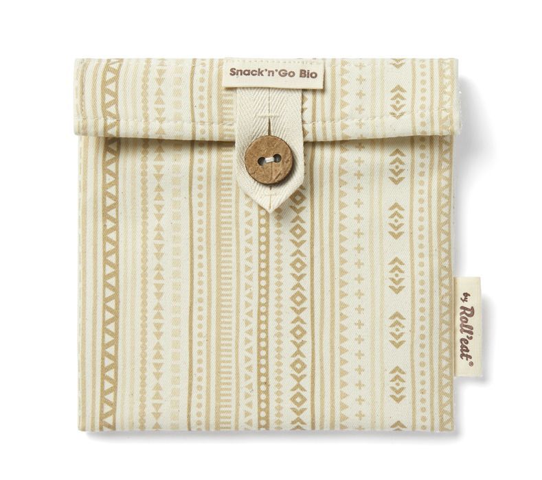 Portasnacks infantil Snack'n'Go Bio Etnia Sign, ideal para niños que llevan comida al colegio o a la guardería. Fabricado en algodón ecológico con estampado étnico geométrico en tonos beige y marrón claro. Cierre seguro con botón de madera y diseño compacto para mantener los alimentos frescos y organizados. Perfecto para snacks saludables y sosteni