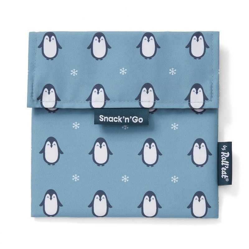 Portasnacks Snack'n'Go Animals Penguin, ideal para niños. Fabricado en poliéster resistente y lavable, con diseño divertido de pingüinos sobre fondo azul. Perfecto para llevar bocadillos, frutas o snacks en el colegio o en el parque. Cierre seguro y fácil de usar. Un accesorio práctico y alegre para el día a día.