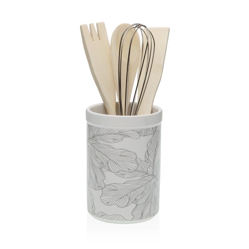 Portautensilios Palmgrey Versa en cerámica con diseño de hojas en tonos grises sobre fondo blanco. Ideal para mantener tus utensilios de cocina organizados y a la vista. Combina funcionalidad y estilo en tu cocina. Perfecto para adultos que buscan un toque decorativo y práctico en su hogar.