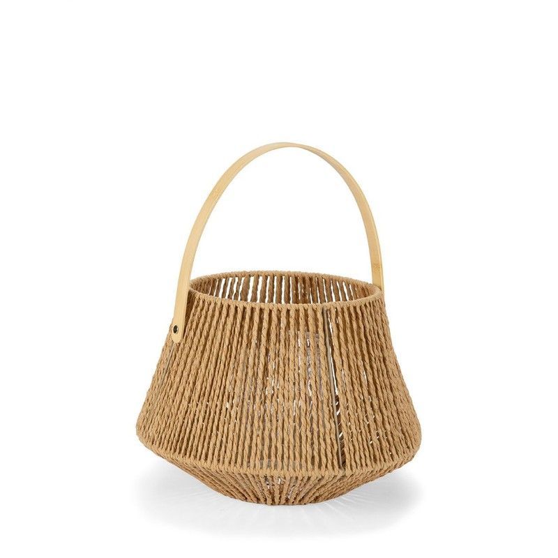 Cesta decorativa de madera natural con forma cónica y asa curva, ideal para uso como portavelas o accesorio de decoración en casa. Su tejido vertical de varillas finas aporta un toque rústico y elegante. Perfecta para espacios con estilo escandinavo, boho o minimalista. Hecha con materiales naturales, combina funcionalidad y diseño.
